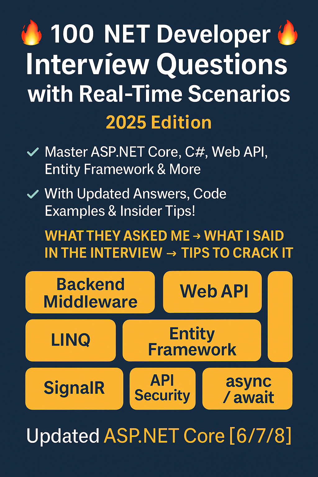 ✅ 100 Most-Asked .NET Interview Questions (2025) ✅ Real-world scenarios from actual interviews (TCS, Infosys, Cognizant, Accenture, and more) ✅ Format: “What they asked me, What I said, Tips to crack it” ✅ Updated for .NET 6 / .NET 7 / .NET 8 concepts ✅ Includes code snippets, diagrams, and architectural best practices ✅ Covers backend, middleware, API security, dependency injection, multithreading, SignalR, async/await, and much more! ✅ Ideal for 2+ to 7 years of experience